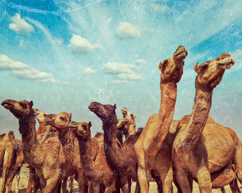 Винтажное ретро-хипстерское туристическое изображение верблюдов на Пушкар Мела (Пушкарская верблюжья ярмарка) с наложенной гранжевой текстурой. Пушкар, Раджастан, Индия
