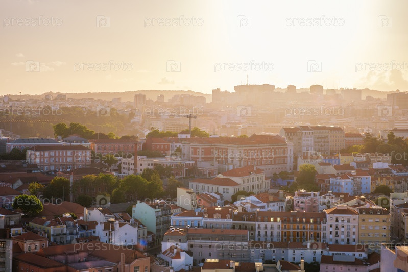 Вид на Лиссабон на закате со смотровой площадки Мирадуро-да-Сеньора-ду-Монте. Лиссабон, Португалия