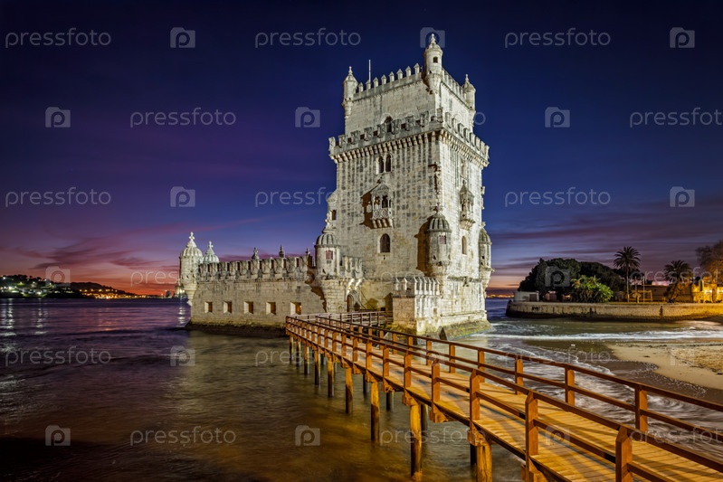 Башня Белем на берегу реки Тежу в сумерках. Лиссабон, Португалия