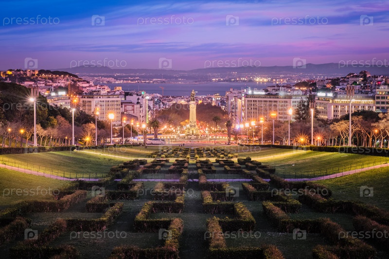 Вид на площадь маркиза Помбала в Лиссабоне из парка Эдуарда VII ночью, Португалия
