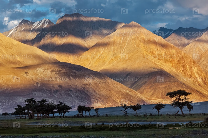 Гималаи на закате с силуэтами деревьев. Долина Нубра, Ладакх, Индия