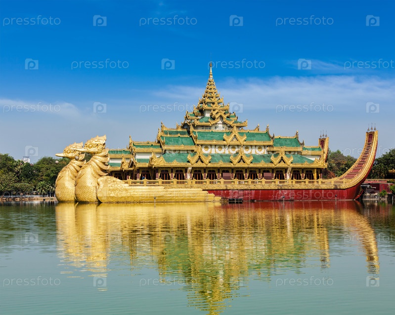 Знаковая достопримечательность Янгона и туристическая достопримечательность Каравейк - копия бирманской королевской баржи на озере Кандавги, Янгон, Мьянма, Бирма