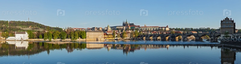 Панорамный вид на Карлов мост через реку Влтаву и Градчаны (Пражский Град) и собор Святого Вита утром, Прага, Чехия