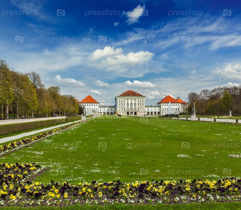 Большой партер (сад в стиле барокко) и вид сзади на дворец Нимфенбург. Мюнхен, Бавария, Германия