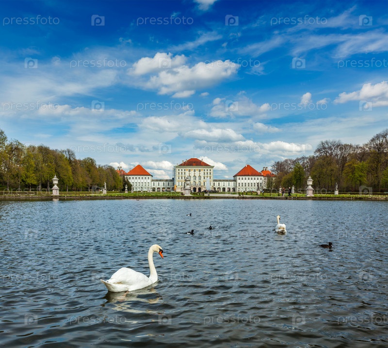 Лебедь в фонтане в Гранд-Партере (сад в стиле барокко) и вид сзади на дворец Нимфенбург. Мюнхен, Бавария, Германия