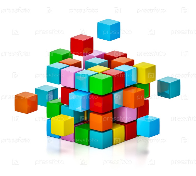 Концепция бизнес-командной работы в Интернете - красочные цветные кубики, собирающиеся в кубическую структуру, изолированную на белом с отражением
