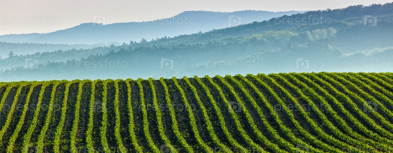 Панорама борозд с ростками на вспаханных полях