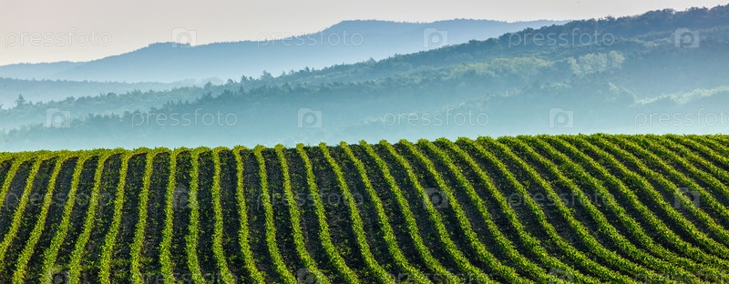 Панорама борозд с ростками на вспаханных полях Моравии, Чехия