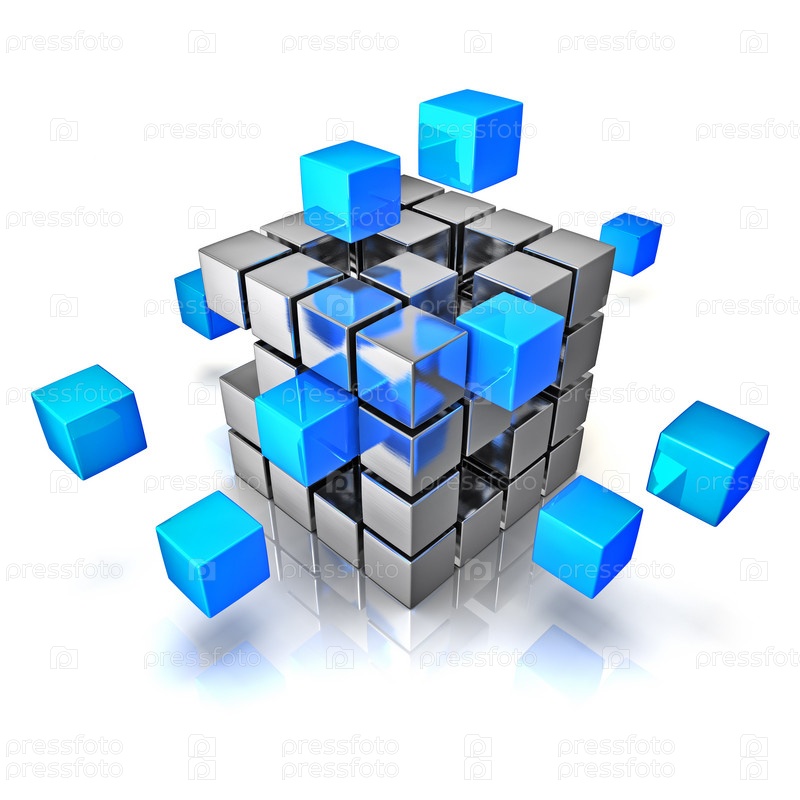 Концепция бизнес-командной работы в Интернете - кубики, собирающиеся в металлическую кубическую структуру, изолированную на белом с отражением