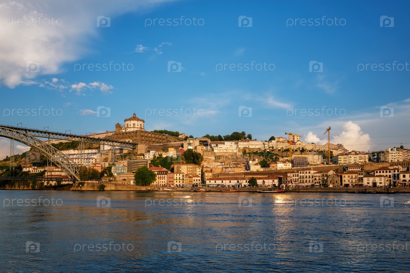 Вид на прибрежный город Вила-Нова-де-Гайя с монастырем Мостеру-да-Серра-ду-Пилар и мостом Дома Луиша I через реку Дору на закате