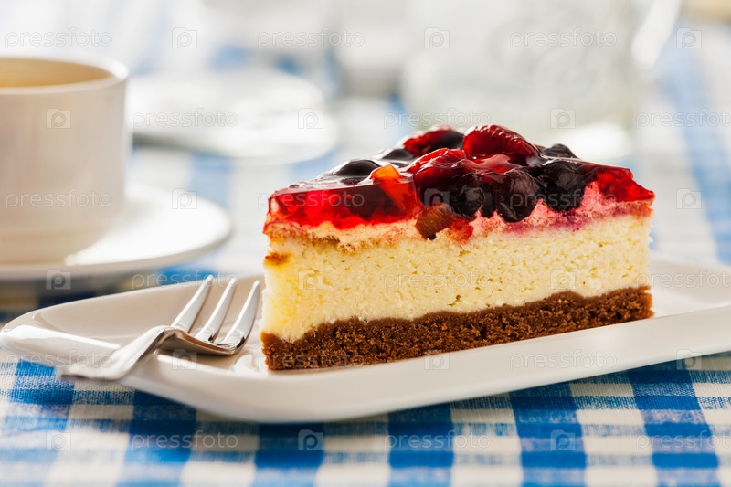 Торт на тарелке с вилкой и чашкой кофе