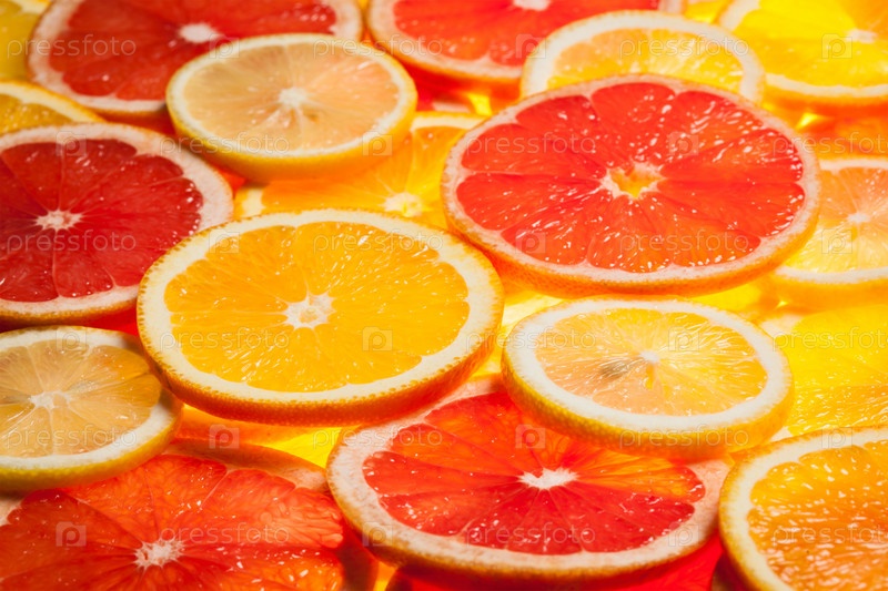 Красочные цитрусовые - лимон, апельсин, грейпфрут - фон ломтиков. с подсветкой