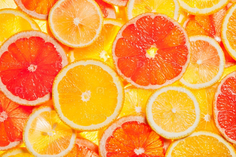 Красочные цитрусовые - лимон, апельсин, грейпфрут - фон ломтиков. с подсветкой