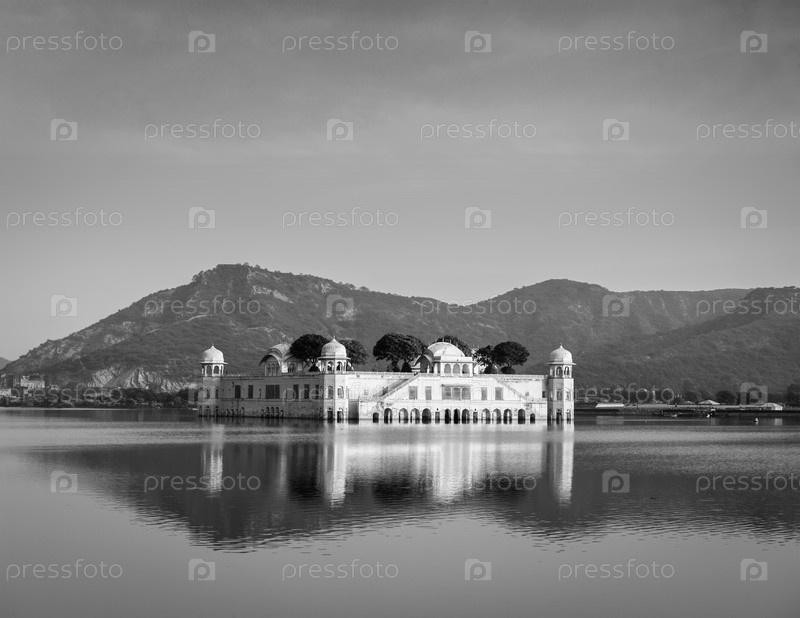Ориентир Раджастана - Водный дворец Джал Махал на озере Ман Сагар на закате. Джайпур, Раджастан, Индия. Черно-белая версия
