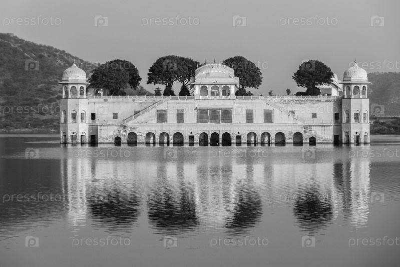 Ориентир Раджастана - Водный дворец Джал Махал на озере Ман Сагар на закате. Джайпур, Раджастан, Индия. Черно-белая версия