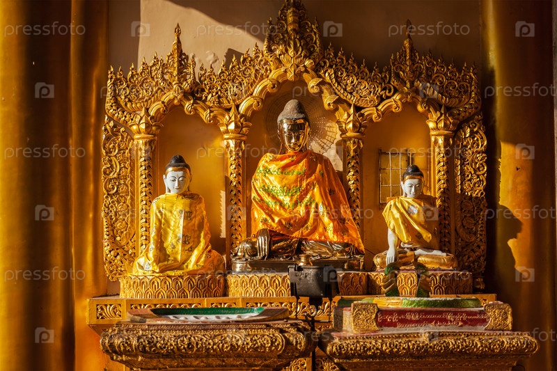 Статуи Будды в известном священном месте Бирмы и туристической достопримечательности - пагоде Шведагон Пайя. Янгон, Мьянма