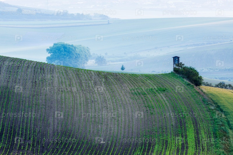 Сельская Европа - моравский холмистый пейзаж с хижиной охотничьей башни ранним утром на восходе солнца. Моравия, Чехия