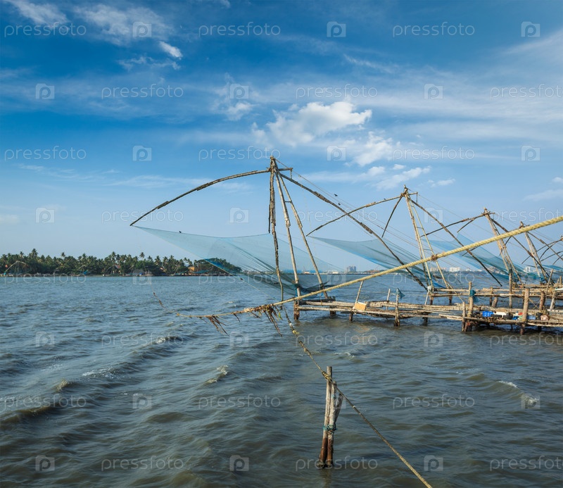 Китайские рыболовные сети Кочи на закате. Форт Кочин, Кочи, Керала, Индия
