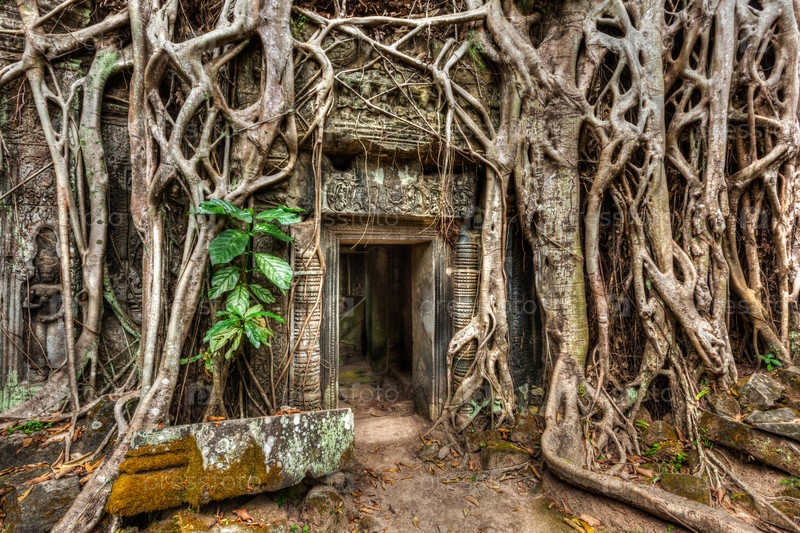 Концепция путешествия в Камбоджу - древние каменные двери и корни деревьев, руины храма Та Пром, Ангкор, Камбоджа