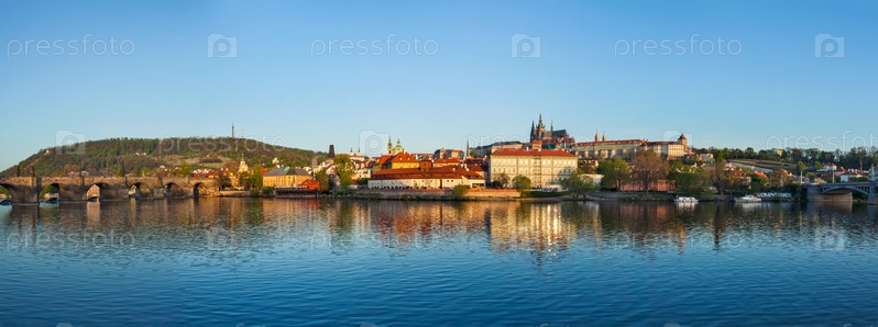 Панорама Праги: Градчаны (Пражский Град), собор Святого Вита и Карлов мост через реку Влтава на закате, Прага, Чехия