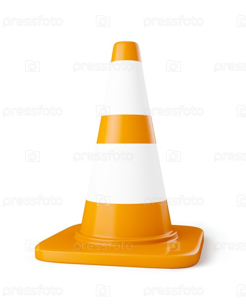 Оранжевый конус дорожного движения с белыми полосами, изолированными на белом