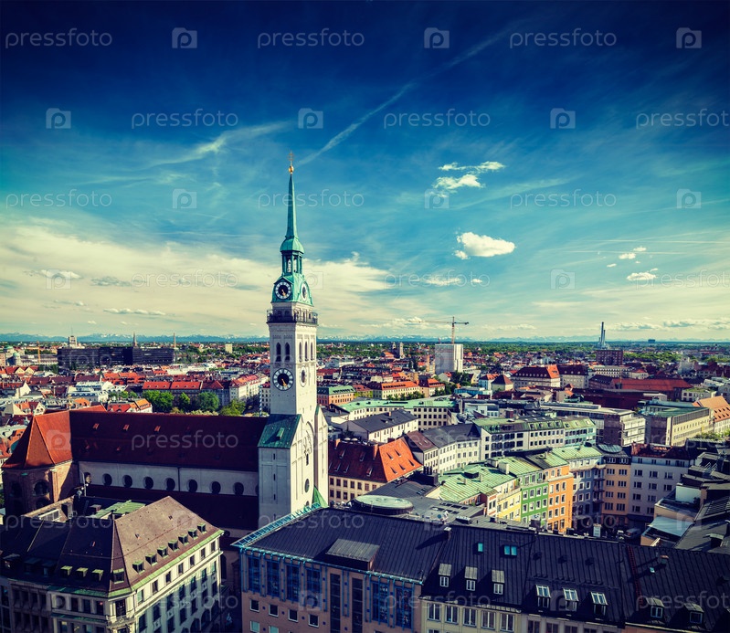 Винтажный ретро-эффект отфильтровал туристический образ в хипстерском стиле с видом с воздуха на Мюнхен и церковь Св. Петра - Мариенплац и Альтес Ратхаус, Бавария, Германия