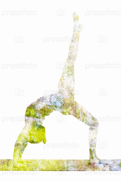 Изображение двойной экспозиции женщины, занимающейся асанами йоги