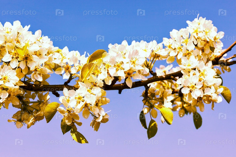 Винтажный ретро-эффект отфильтровал хипстерский стиль изображения цветущей ветки яблони весной на фоне голубого неба