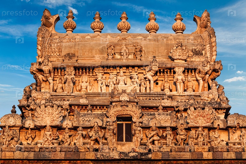 Входная башня (гопура) храма Периянаяки Амман на фоне неба. Храм Айраватешвара, Дарасурам, Тамил Наду, Индия