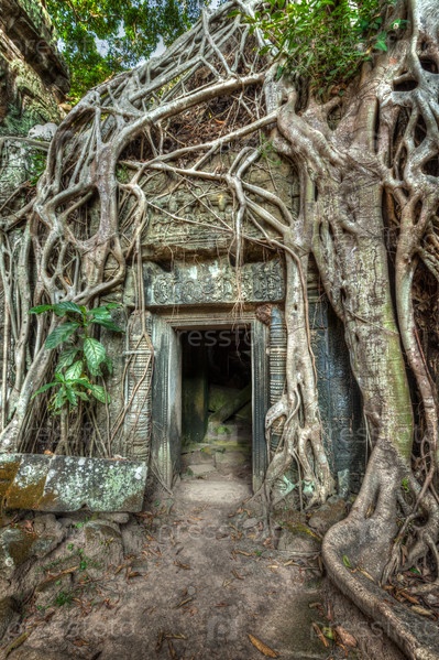Древняя каменная дверь и корни деревьев, храм Та Пром, Ангкор