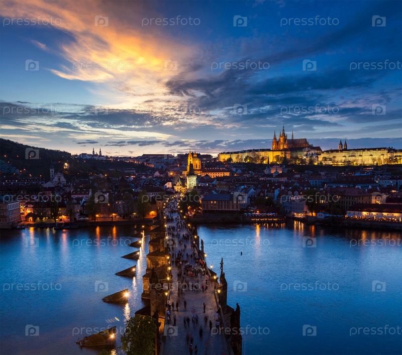 Ночной вид на Пражский Град и Карлов мост через реку