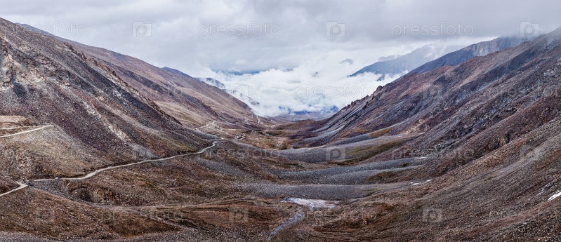 Пейзаж Гималайской долины с дорогой возле перевала Кунзум Ла - предположительно самого высокого перевала в мире (5602 м), Ладакх, Индия