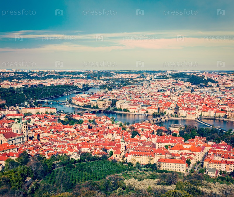 Вид на Карлов мост через реку Влтаву и Старый город из Петри