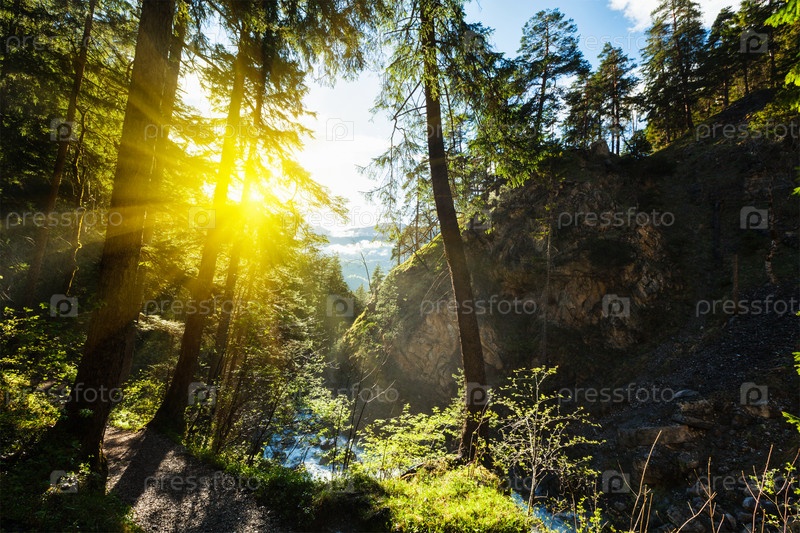 Зеленый лес с солнечными лучами