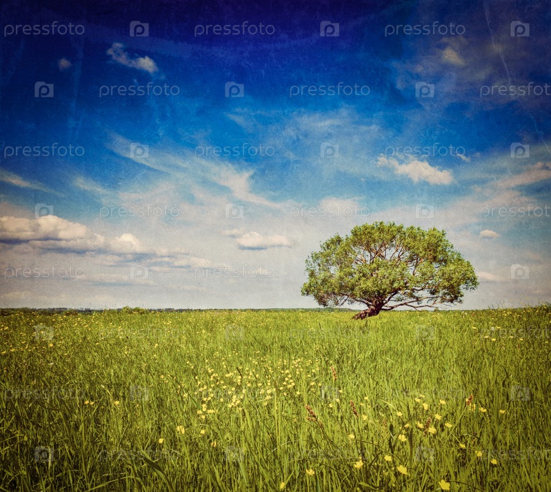 Весенний летний пейзаж зеленого поля с одним деревом