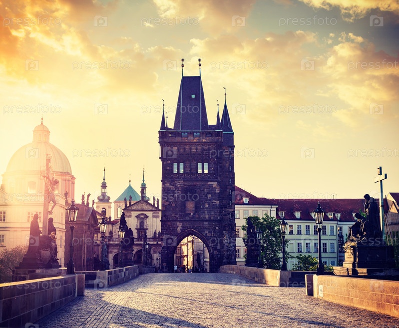 Винтажное ретро-хипстерское туристическое изображение башни Карлова моста в Праге на восходе солнца, Чехия