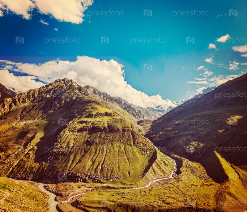 Винтажный ретро-эффект отфильтровал хипстерский стиль путешествия по Гималайской долине в Гималаях. Долина Лахаул, Химачал-Прадеш, Индия
