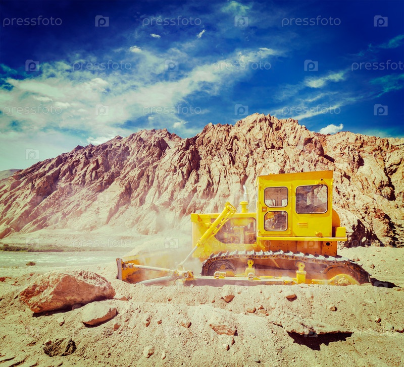 Винтажный ретро-эффект отфильтровал образ путешествия в хипстерском стиле, на котором бульдозер занимается строительством дорог в Гималаях. Ладакх, Джамму и Кашмир, Индия