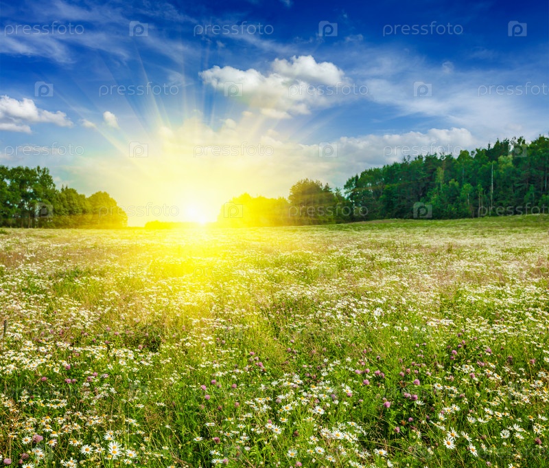 Летнее цветущее зеленое луговое поле с цветами с солнцем и голубым небом