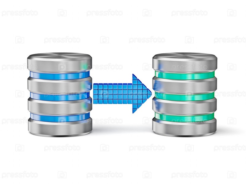 Творческая концепция резервного копирования базы данных - значки базы данных на металлическом жестком диске со стрелкой, изолированной на белом
