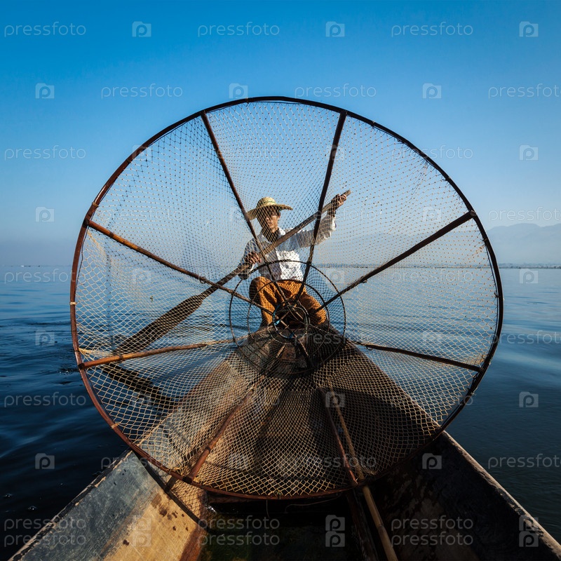 Достопримечательность Мьянмы - традиционный бирманский рыбак с рыболовной сетью на озере Инле в Мьянме, известный своим характерным стилем гребли на одной ноге