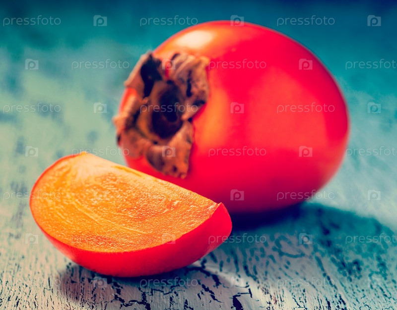 Винтажный ретро-эффект отфильтровал изображение в стиле хипстеров свежей спелой хурмы с ломтиком на синем деревянном фоне