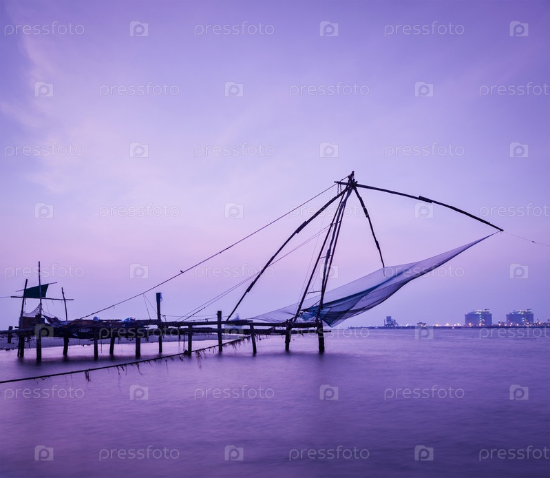 Китайские рыболовные сети Кочи на закате. Форт Кочин, Кочи, Керала, Индия
