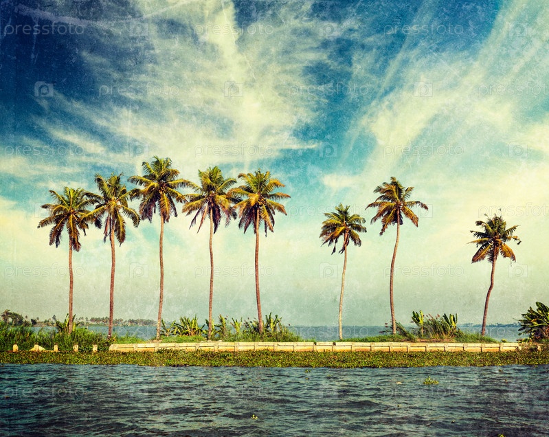 Винтажное ретро-хипстерское туристическое изображение пальм в заводях Кералы с наложенной гранжевой текстурой. Керала, Индия
