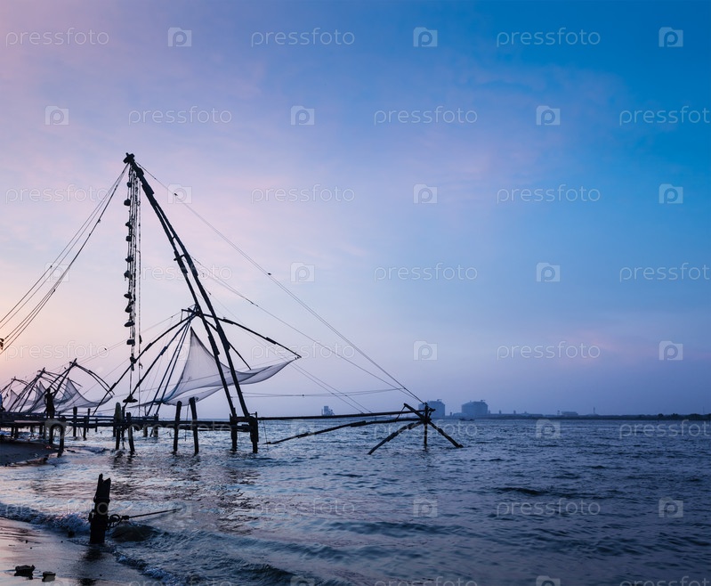 Китайские рыболовные сети Кочи на закате. Форт Кочин, Кочи, Керала, Индия