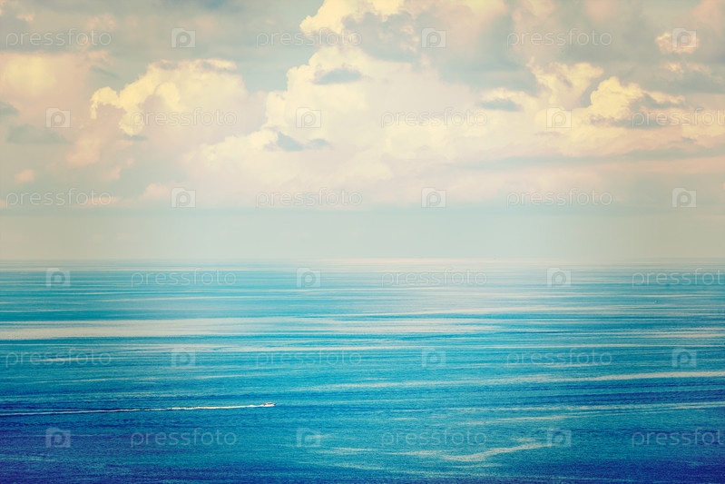 Винтажный ретро-эффект отфильтровал образ путешествия в стиле хипстеров, изображающий мчащуюся лодку в синем море. Андаманское море, Таиланд