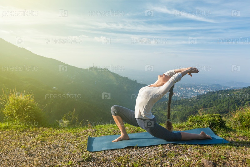 Женщина занимается йогой асаной Анжанеясана в горах
