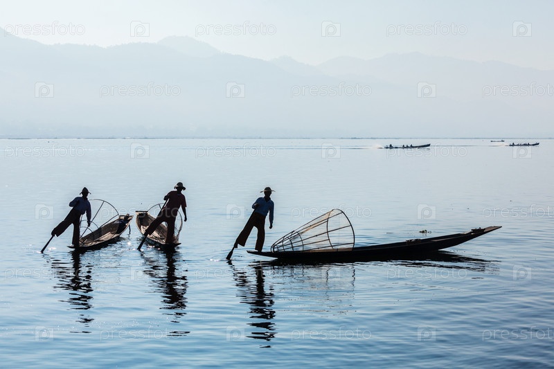 Достопримечательность Мьянмы - традиционный бирманский рыбак на озере Инле, Мьянма, известный своим характерным стилем гребли на одной ноге