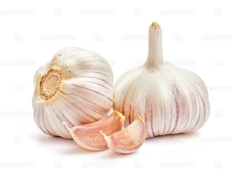 Две луковицы чеснока и гвоздики изолированы на белом фоне