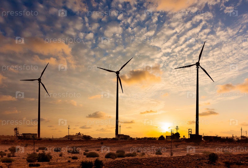 Концепция зеленой возобновляемой энергии - силуэты ветрогенераторов на закате